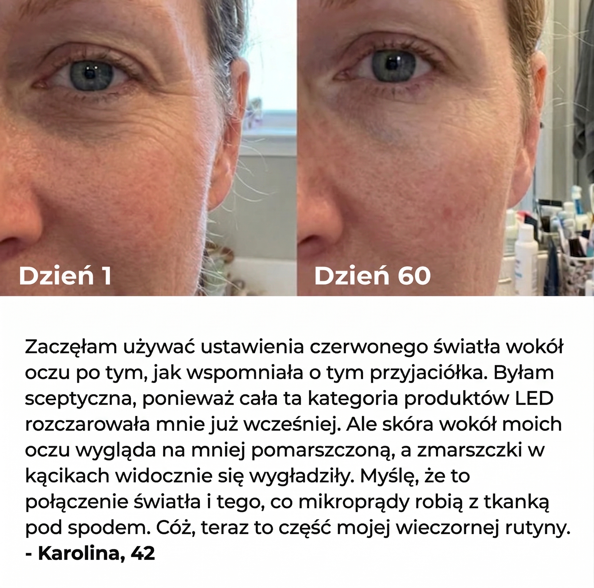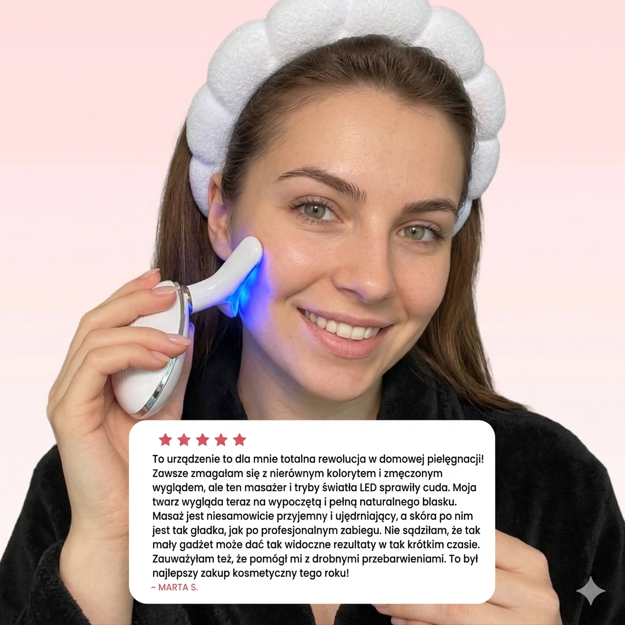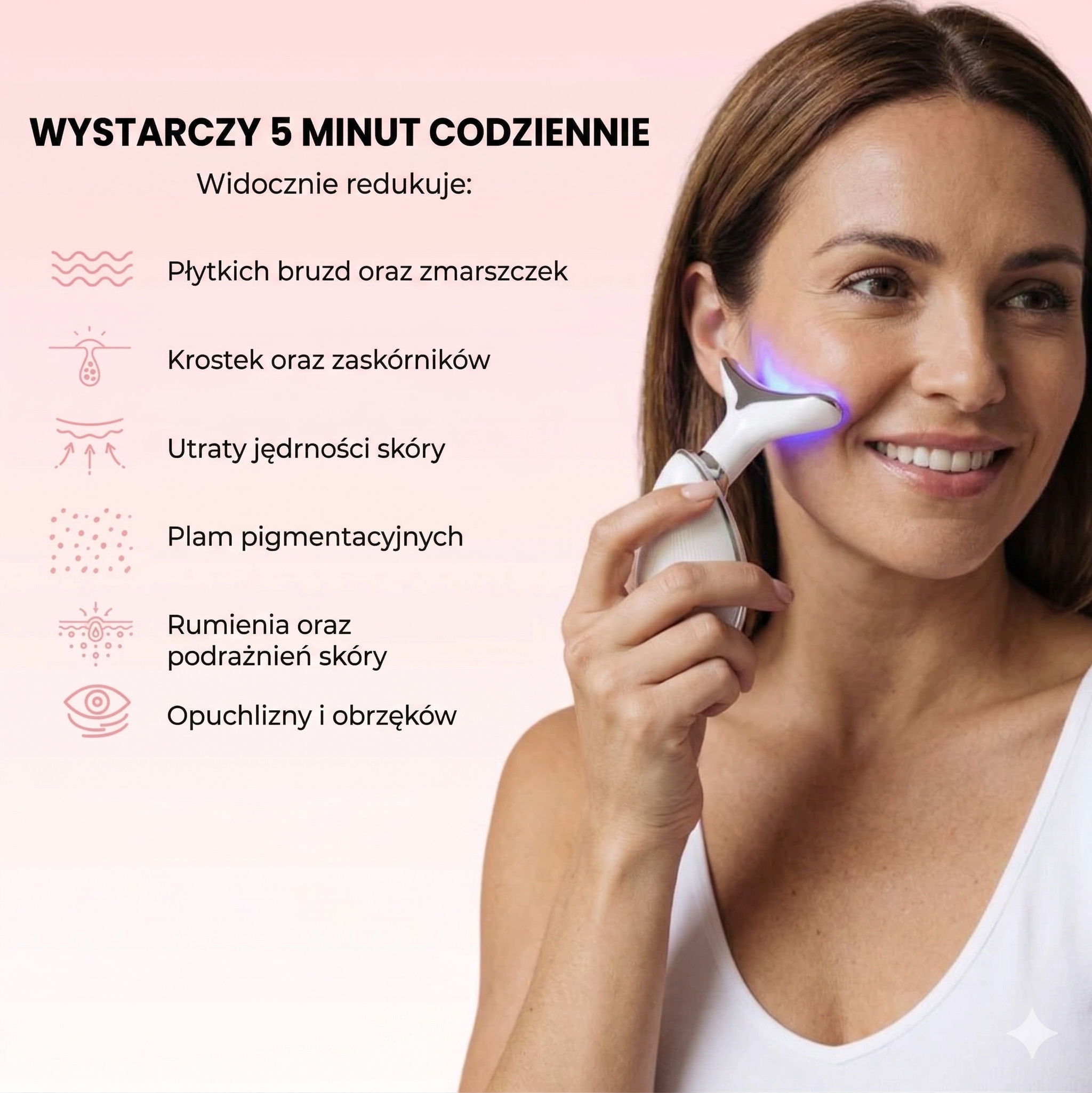 • 🟢 Zielone światło LED – pomaga wyrównać wygląd kolorytu skóry