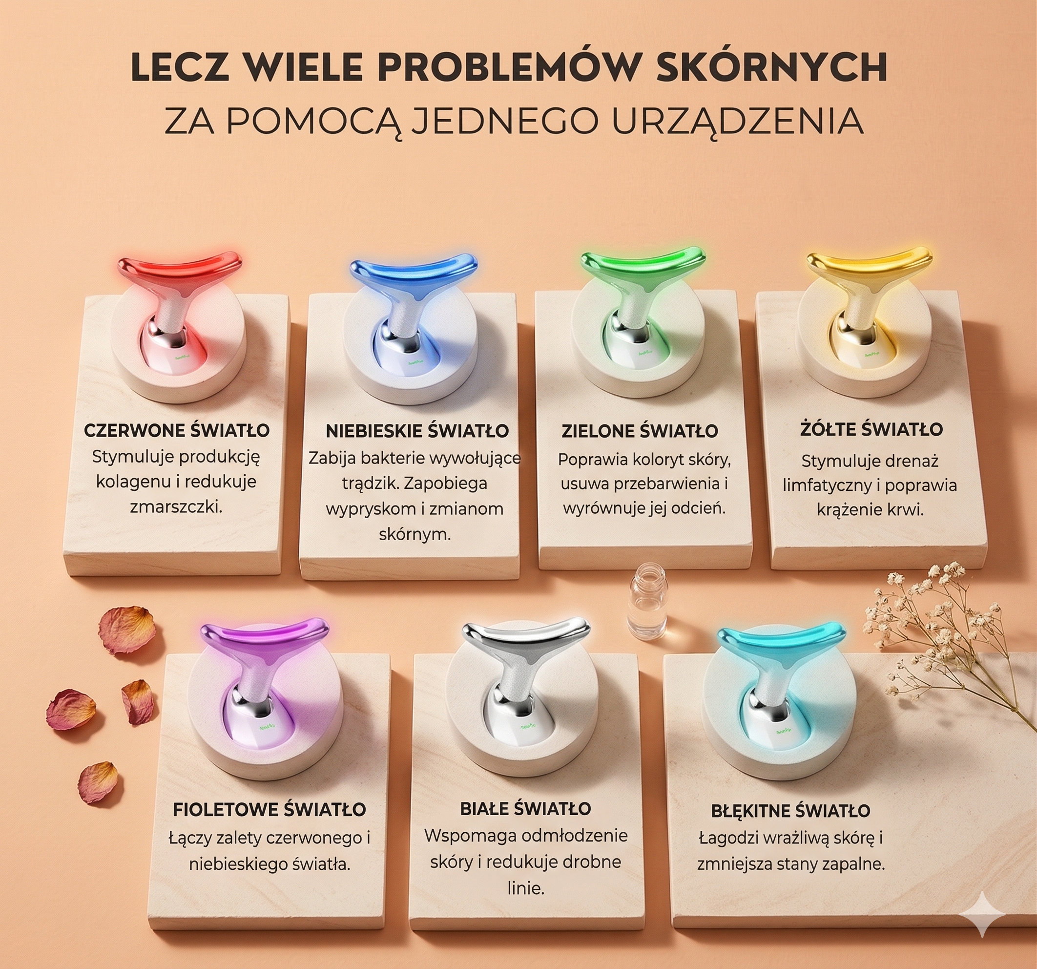 ✨ 7 trybów terapii światłem LED – kompleksowa pielęgnacja